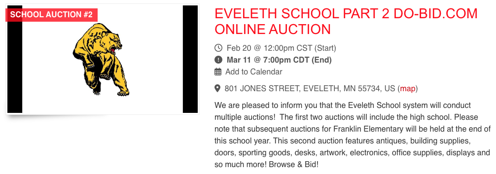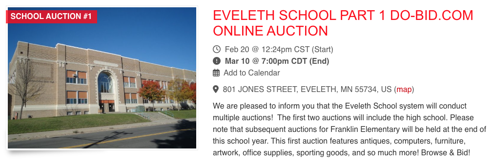 To get to the Eveleth School Campus Online Auctions, please go to www.do-bid.com and click on either auction as pictured here. When you enter the auction, make sure to click on “Item #0 DETAILS & TERMS” for information about Preview Dates, Payment Terms, and the Load Out/Pick Up Dates for any item won. Please feel free to pass this information on to others who may be interested.